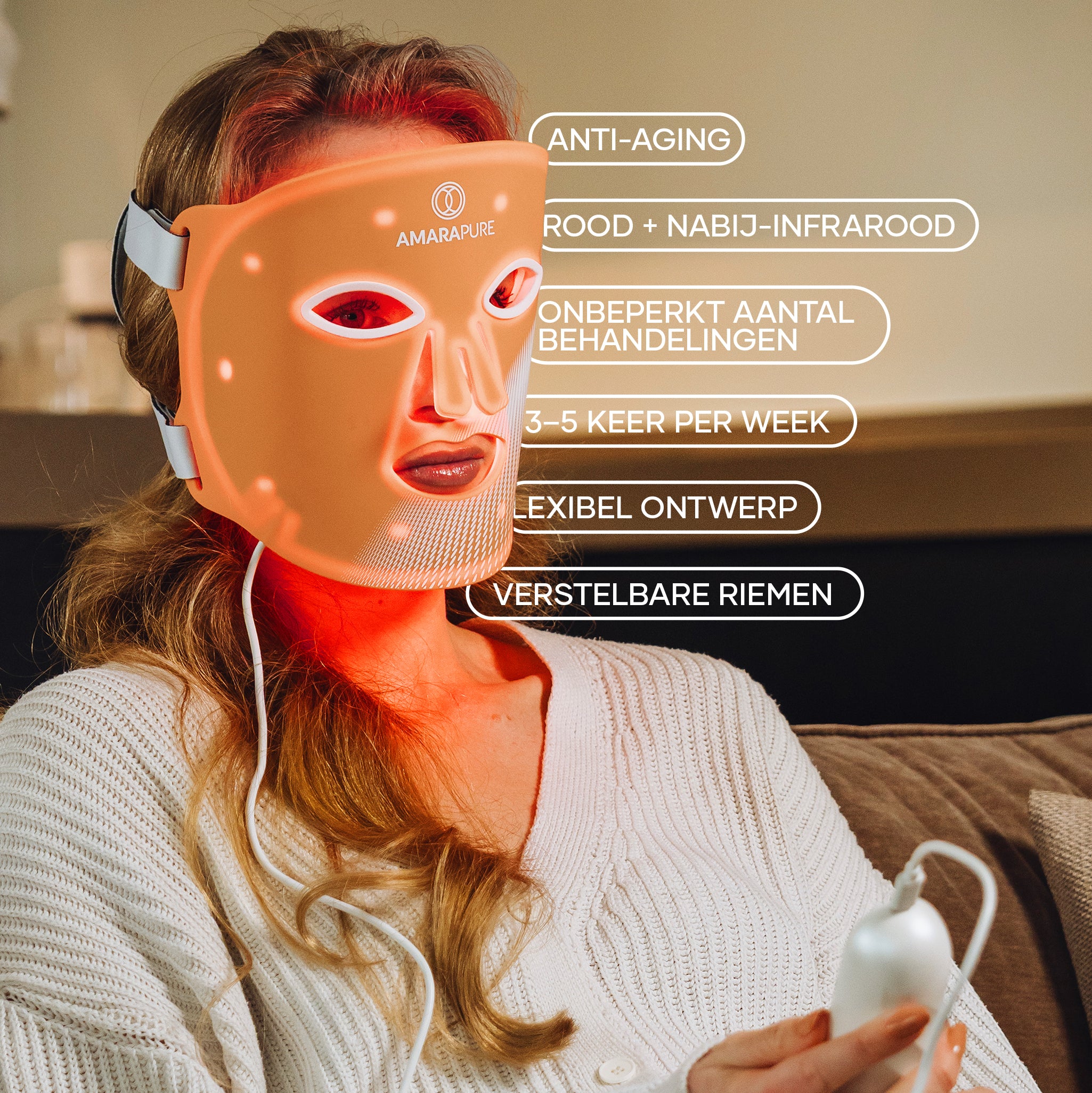 Het roodlichtmasker stimuleert de collageenproductie en verbetert de huidstructuur. Je huid voelt steviger, gladder en zichtbaar frisser – elke dag opnieuw.