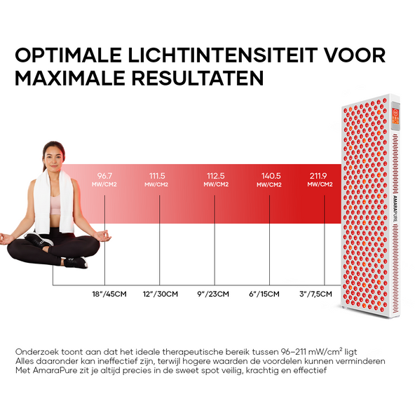 • Afstand & duur: 5–10 minuten per zone als start; bouw op naar 10–20 minuten per gebied. Houd 15–45 cm afstand volgens de handleiding. Start met 3–5 sessies per week.