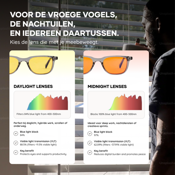 Onze blauwlichtbrillen bieden wetenschappelijk bewezen bescherming voor uw ogen en uw slaap. Ze zijn ideaal voor iedereen die veel tijd voor schermen doorbrengt, zowel overdag als 's avonds.