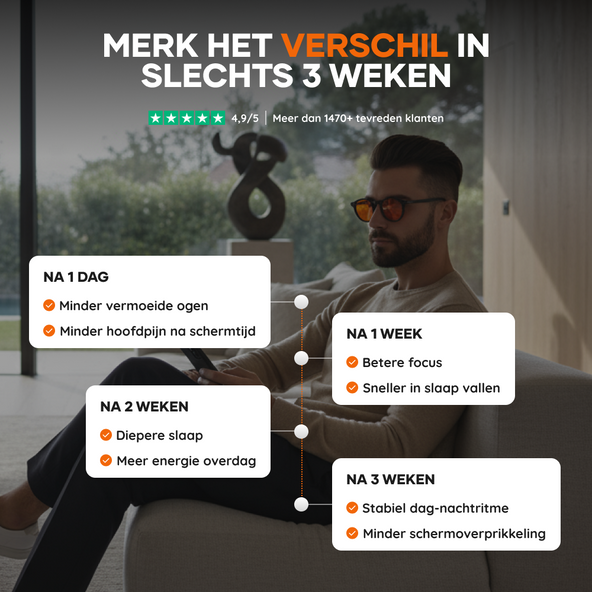 Voor het beste en langdurige resultaat gebruik je de bril consistent. Dagelijkse bescherming garandeert een optimaal functionerend bioritme en vermindert structureel digitale oogstress.