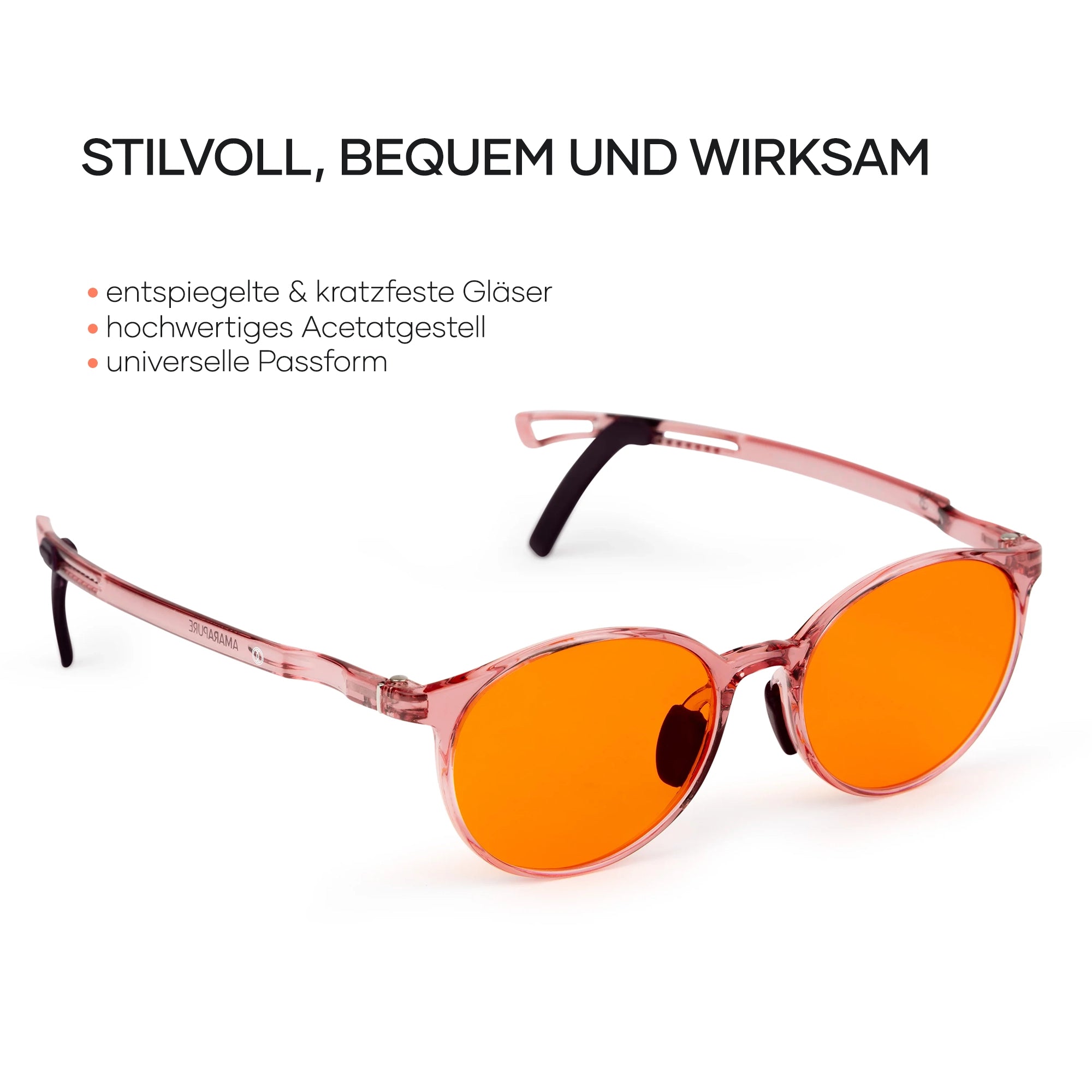 Entdecken Sie die einzigartigen Eigenschaften unserer AmaraPure Blaulichtbrille. Bewegen Sie den Mauszeiger über die Hotspots, um mehr über Design, Schutz und Komfort dieser Brille zu erfahren.