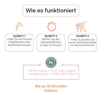 Füllen Sie Ihre Wasserstoffflasche einfach mit Ihrem bevorzugten Trinkwasser. Verwenden Sie gefiltertes oder gereinigtes Wasser für beste Ergebnisse.