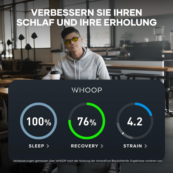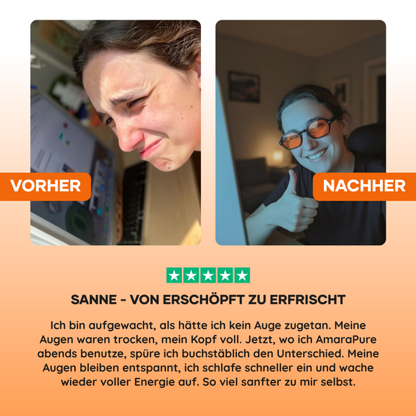 Entspannen Sie sich und schlafen Sie nach einem langen Tag schneller ein. Bildschirme strahlen blaues Licht aus, das die Produktion des Schlafhormons Melatonin unterdrückt. Tragen Sie Ihre Amarapure-Brille abends (1–2 Stunden vor dem Schlafengehen), um: